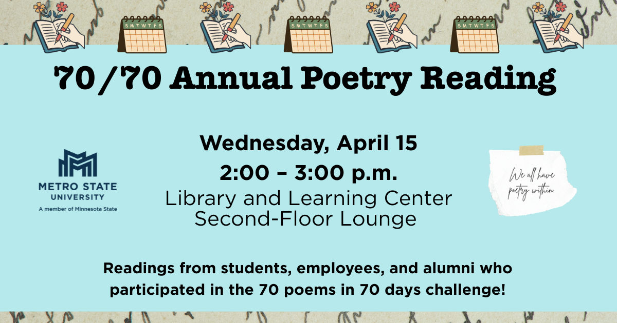The Metro State Library and Learning Center invites you to the 70/70 Annual Poetry Reading. Poets will be reading work created during a “70 poems in 70 days” challenge, where Metro State students, faculty, staff, and alumni agreed to write one poem each day for the first 70 days of the year. Participants had the opportunity to explore poetry, build a daily writing habit, and connect with fellow writers. Come hear their impromptu poems and works in progress, and celebrate their completion of the challenge!